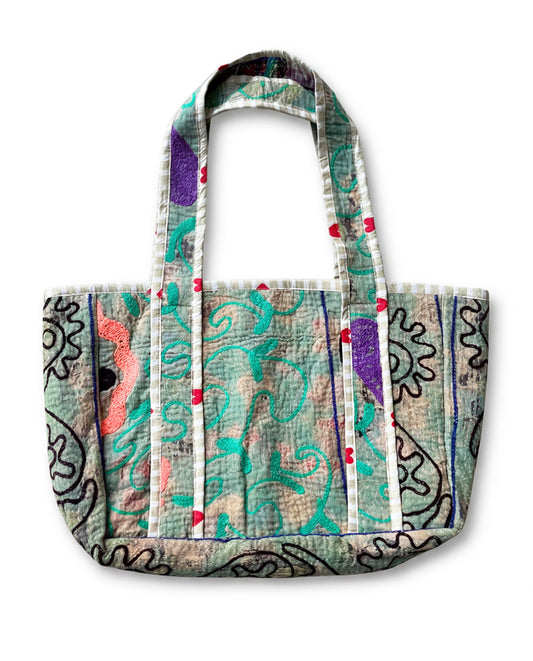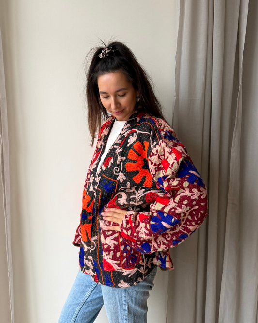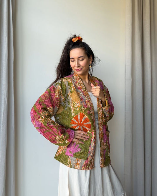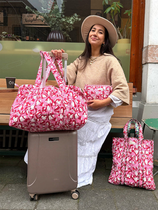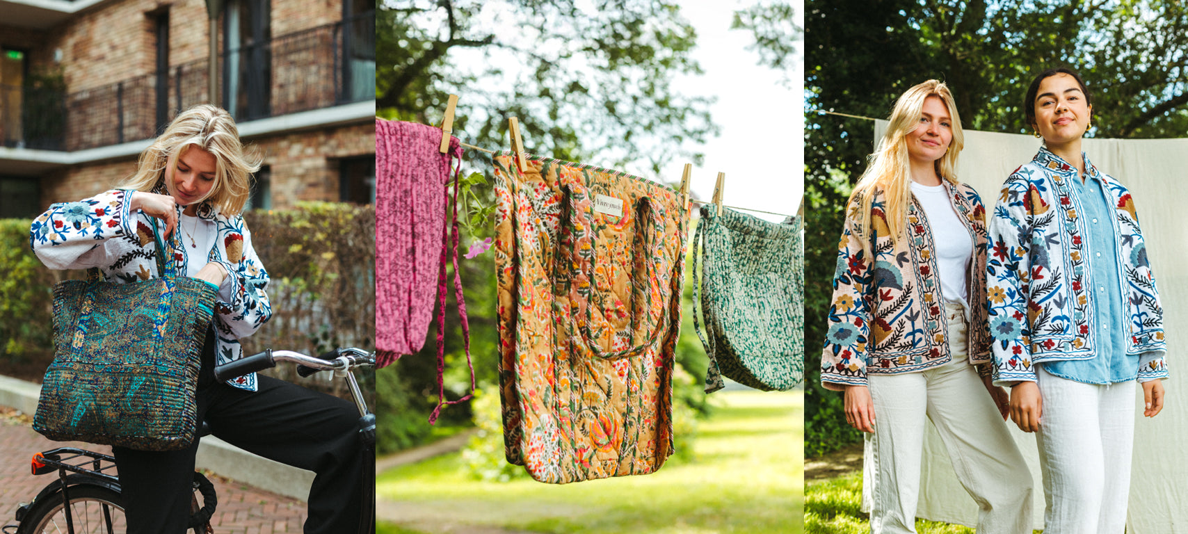 Onze Indiase ambachtslieden gebruiken diverse materialen en technieken, zoals de blockprint-techniek met houten stempels voor unieke patronen op stoffen. De collectie omvat ook hergebruik van zijden sari's en kantha vintage dekens, die nieuw leven krijgen als tassen of kimono's. Met deze items draag je niet alleen mooie kleding, maar ook een stukje India met je mee.