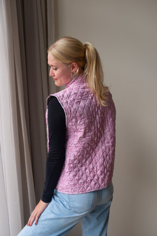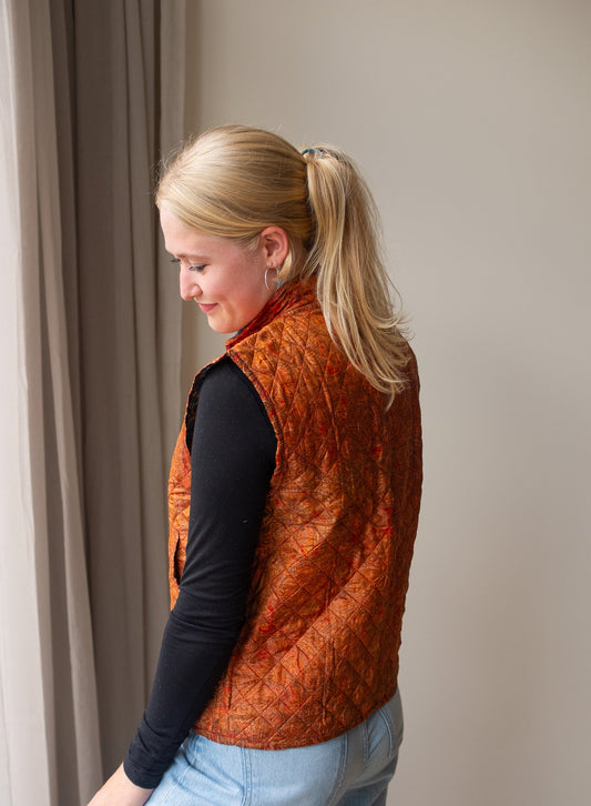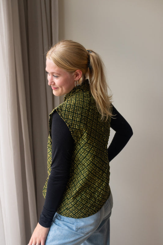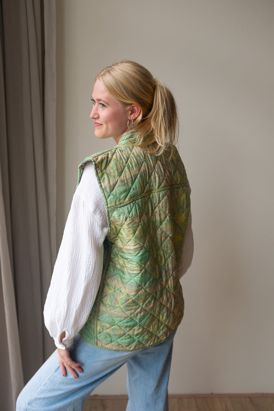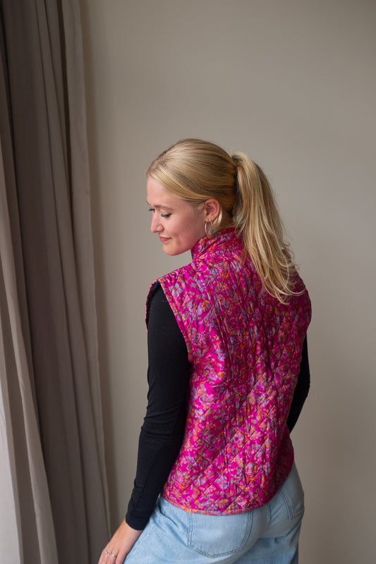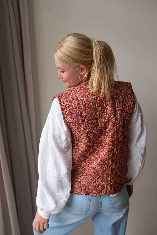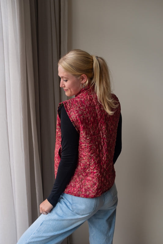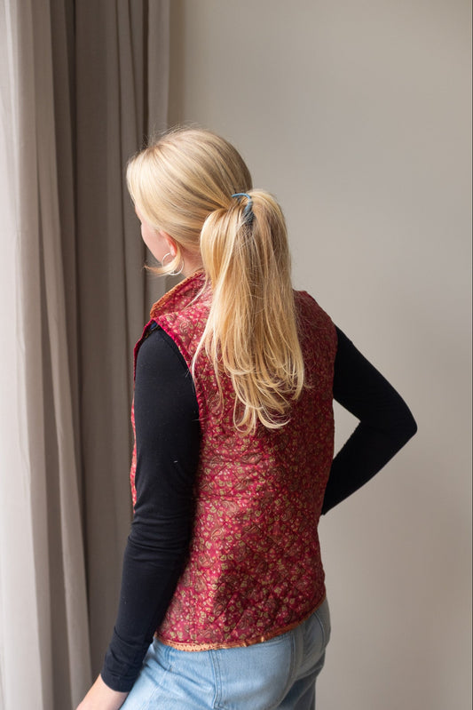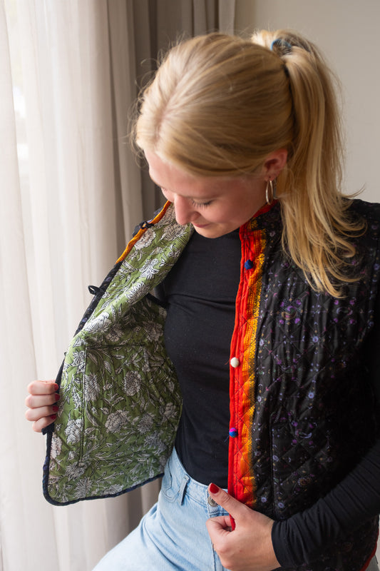 Naast onze standaard zijden gilets, bieden we ook reversible zijden gilets aan. Dit prachtige, handgemaakte gilet heeft een mooie print van sari stof en zakken aan zowel de buiten- als de binnenkant, waardoor je het aan beide zijden kunt dragen! Hierdoor kun je het gilet eenvoudig stylen en geniet je van twee gilets in één aankoop.