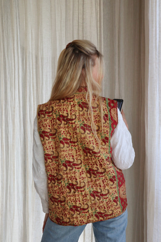 Ontdek onze unieke collectie giletjes met levendige prints, die het culturele erfgoed van India tot leven brengen. Elk giletje is een unieke creatie, met de hand vervaardigd in India van gerecyclede vintage stoffen zoals Sari's. Ontdek ook onze reversible gilets, die aan zowel de binnen- als buitenkant andere kleuren en prints hebben! Laat elke outfit stralen met een giletje van Vivre-Atelier ♥