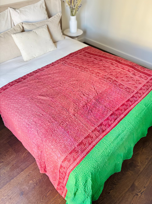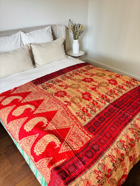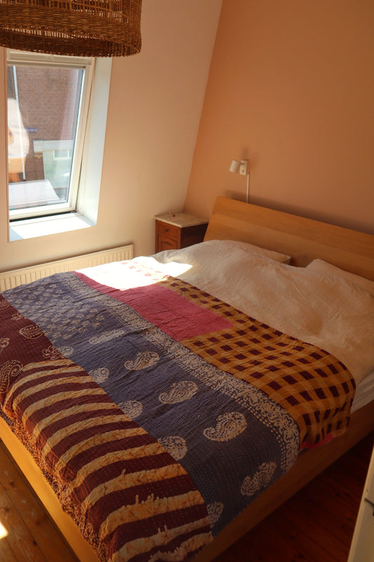 Kantha is een eeuwenoude traditie waarbij verschillende lagen stof met de hand aan elkaar worden genaaid. Deze kunstvorm vindt zijn oorsprong in het oosten van India en Bangladesh. Vrouwen gebruikten oude stoffen en gedragen sari's om prachtige dekens te creëren, die niet alleen henzelf maar ook hun families warm hielden. Bijzondere trouw-kantha's werden zelfs gemaakt voor dochters, soms al gestart door grootmoeders bij de geboorte van een meisje! Elke kantha quilt is uniek en draagt het cultureel erfgoed en vakmanschap van India met zich mee.