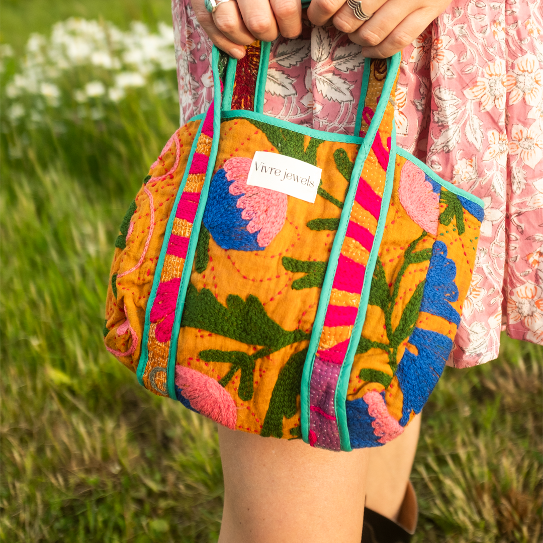 Bij Vivre Jewels koesteren we onze planeet. Daarom omarmen we milieuvriendelijke praktijken en steunen we vakmensen die met liefde tassen maken van duurzame, hergebruikte en gerecyclede materialen zoals vintage stoffen of sari's. Ons doel is niet alleen om prachtige en authentieke tassen aan te bieden, maar ook om duurzame en handgemaakte tassen te creëren van gerecycled materiaal.