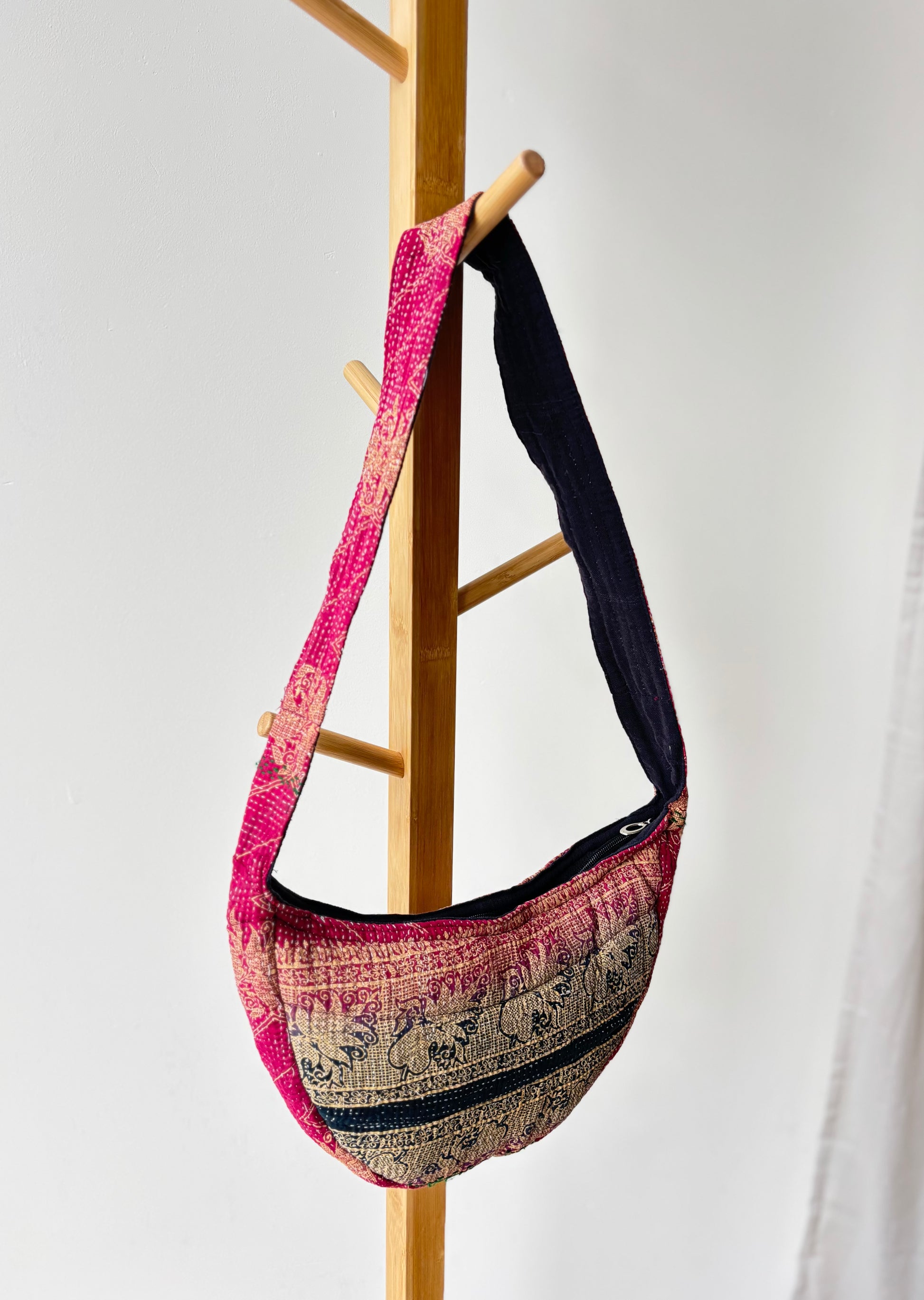Deze kantha cross body tas is met veel liefde handgemaakt in India. Kantha stoffen bestaan uit verschillende lagen stof die op elkaar zijn vast gemaakt. Deze prachtige tas is gemaakt van vintage kantha stof. Op deze manier worden de stoffen hergebruikt en krijgen ze een heel nieuw leven (helemaal duurzaam dus)! Het kan dus zijn dat er wat versleten plekjes zichtbaar zijn. Dit hoort bij de tas en daaronder zit een nieuwe laag stof.