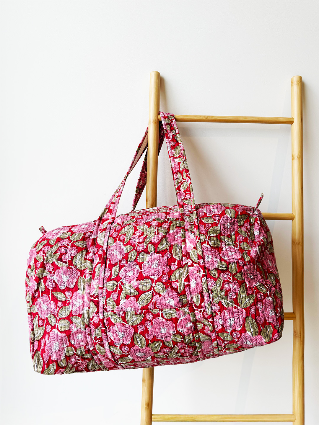Beide items zijn met de hand gemaakt in India van katoen en combineren functionaliteit met een vrolijke, tijdloze uitstraling. De toilettas houdt je essentials overzichtelijk bij elkaar, terwijl de duffelbag ruimte biedt voor alles wat je onderweg nodig hebt.