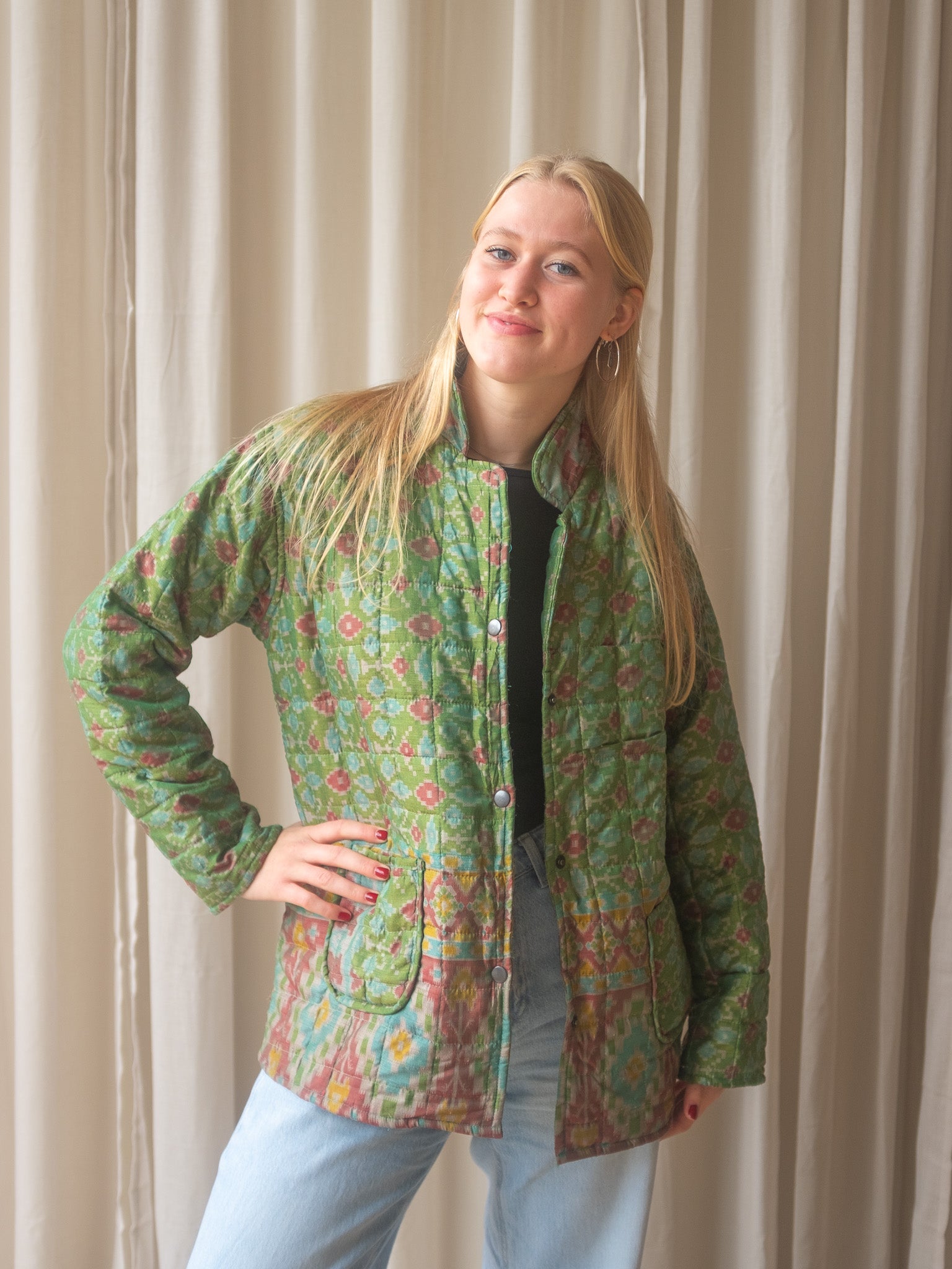 Deze prachtige jas is met handgemaakt in India. De jas is gemaakt van Sari stoffen. Deze stoffen zijn van 100% zijde. De stoffen hebben prachtige details en patronen.