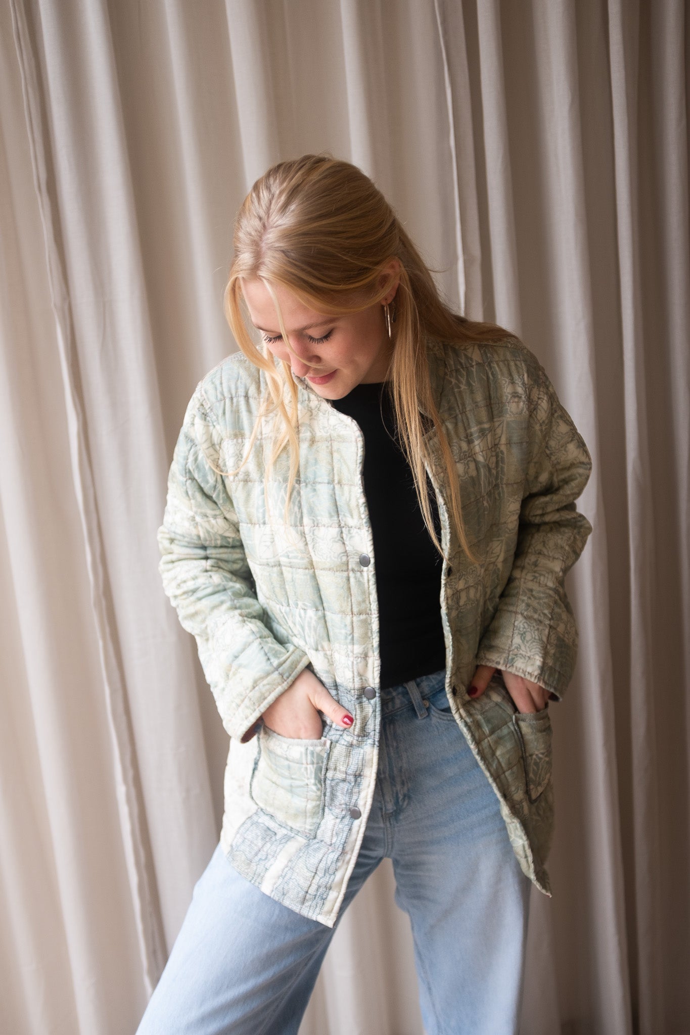 Deze prachtige jas is met handgemaakt in India. De jas is gemaakt van Sari stoffen. Deze stoffen zijn van 100% zijde. De stoffen hebben prachtige details en patronen.
