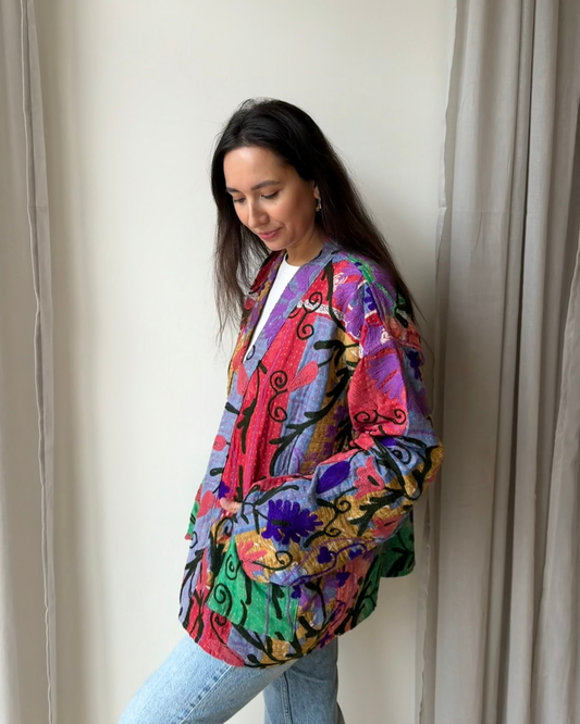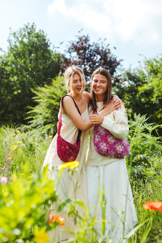 Onze Indiase ambachtslieden gebruiken diverse materialen en technieken, zoals de blockprint-techniek met houten stempels voor unieke patronen op stoffen. De collectie omvat ook hergebruik van zijden sari's en kantha vintage dekens, die nieuw leven krijgen als tassen of kimono's. Met deze items draag je niet alleen mooie kleding, maar ook een stukje India met je mee.